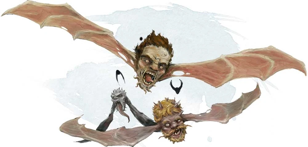 The Vargouille is a grotesque, flying head with bat-like wings sprouting from either side of its severed neck. Its features are twisted and infernal, with a paralyzing gaze and a haunting screech.